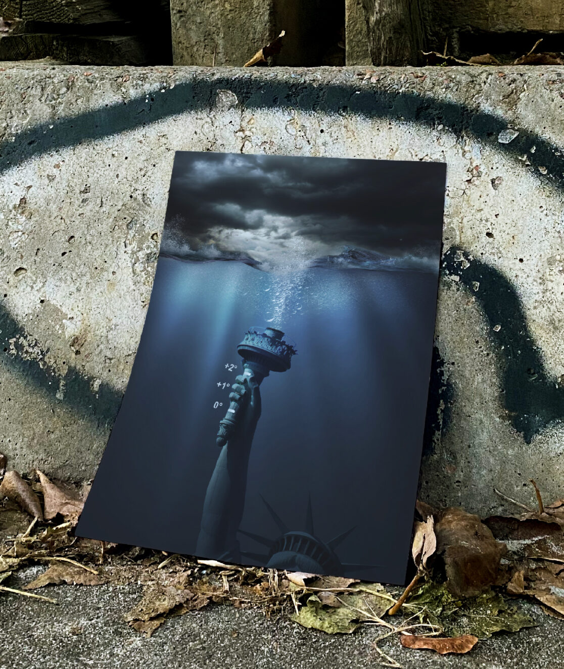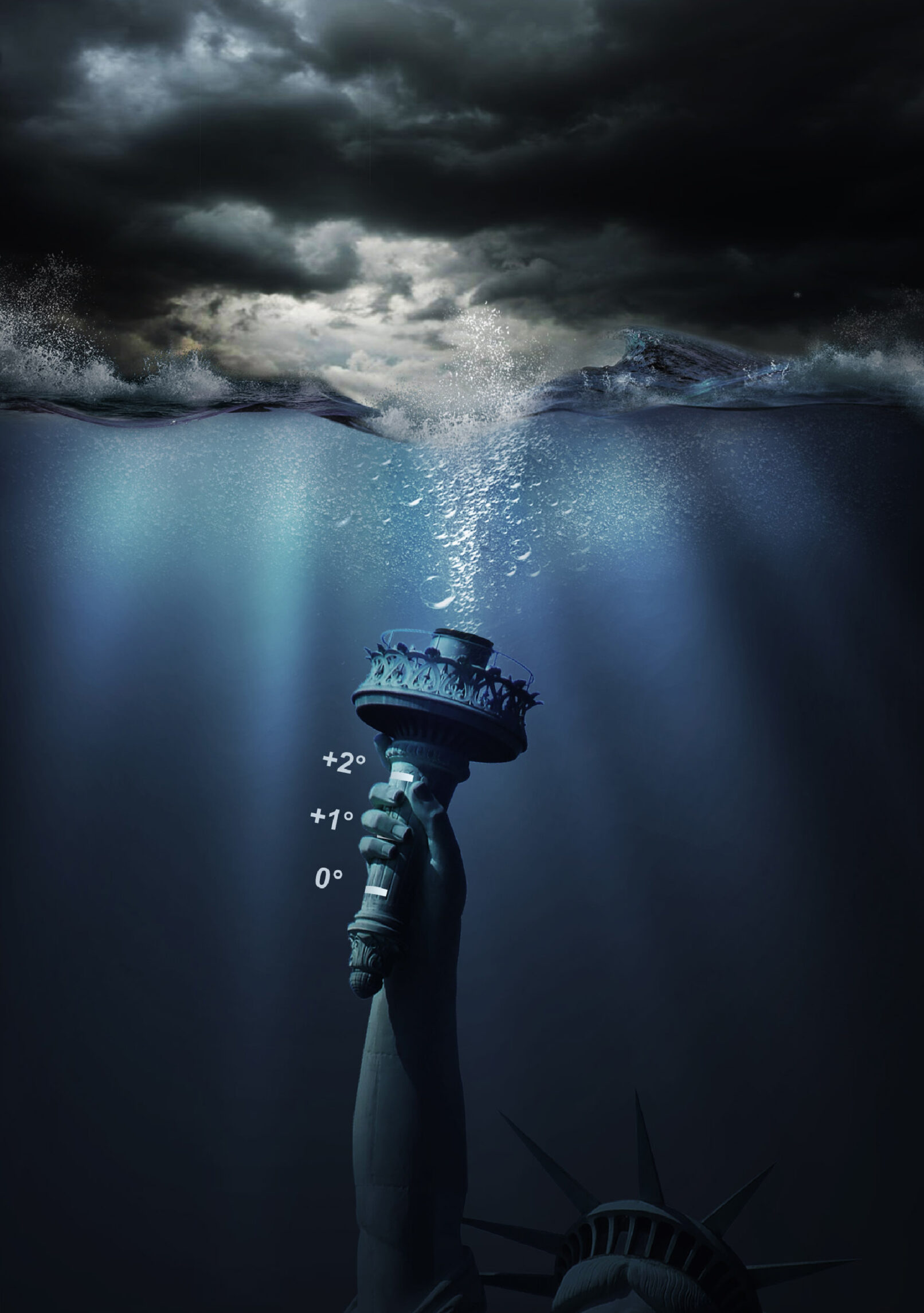 Affiche pour le mouvement « Plus 2 degrés » dénonçant les bouleversements planétaires telle que la montée des eaux à partir de 2 degrés supplémentaires.